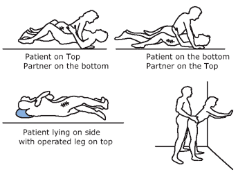 Total hip replacement precautions need to be observed during all activities, including sexual intercourse. In general, follow the do's and don'ts on pages 26-27 and the positions illustrated on page 29. As advised in the discharge instructions, you should avoid excessive hip flexion (knee toward chest), adduction (leg towards center of body), and internal rotation (toes turned inward).